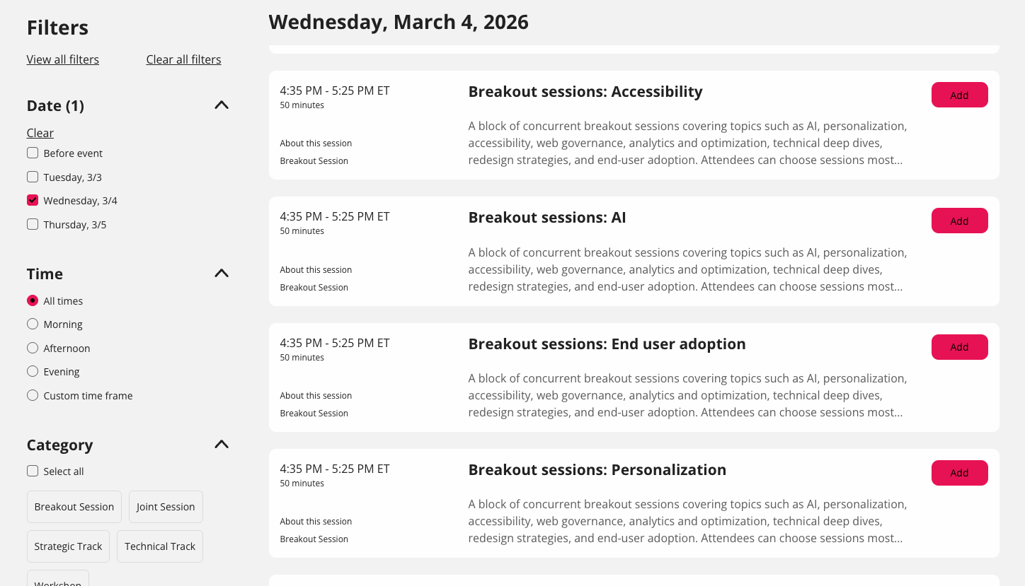 Breakout Sessions occur on March 4, 2026, from 4:35 PM (ET) to -5:35 PM (ET). Here are this year's Breakout topics: